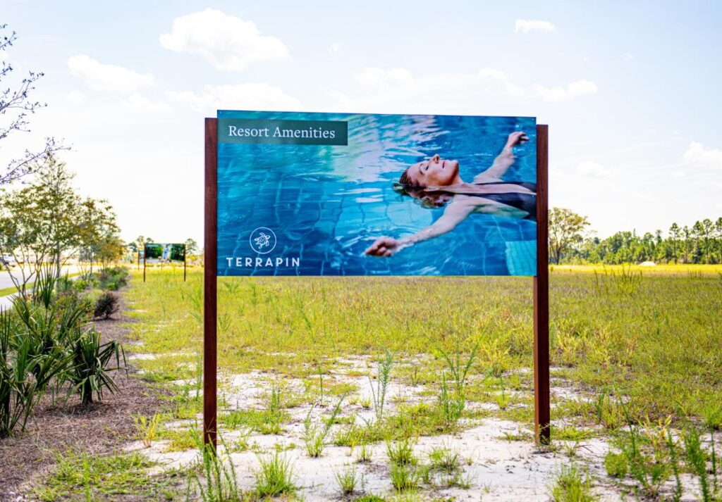 Swimming pools, pickleball courts, walking trails, and firepits. None of these features exist yet at the Terrapin development in Leland, but even in this early stage, future residents can already picture themselves not only living there but building a life there. That’s because the signage we have installed is helping the community feel real long before the physical place fully exists.